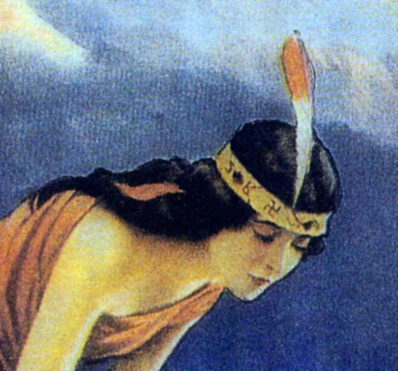 The basic design of this headband is very similar to that of the one that appears in Tonnesen's photo. In comparing the two, keep in mind that the headband would not always be placed on the head in the same position and that illustrators may have only approximated the original design in their final rendition. As with most of the photos and prints that I have examined, it appears the feather was added after the photo was taken. While it's impossible to say for sure, I think it's likely this print may have originated as a photo by Tonnesen.